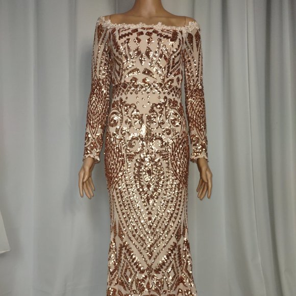 Fashion Nova pink sequined floor length 1920s style great Gatsby dress. long sleeve 100% polyester