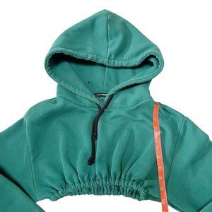 Fashion Nova teal cropped elastic waist pullover hooded sweatshirt size XS. Gently used condition. Pull over, drawstring neckline. Please see photos for measurements. Please see photos for material. Gently used condition.