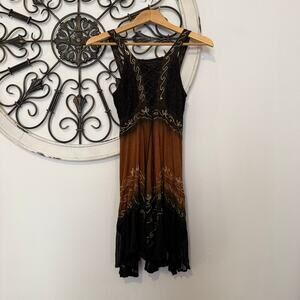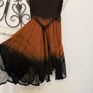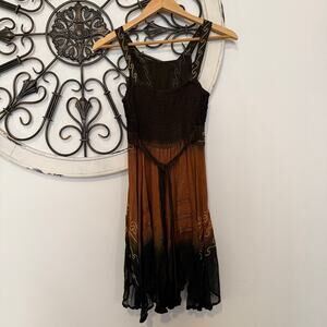 A stunning piece that blurs the line between boho and gothic romance. This whimsigoth-style tunic features a rich ombré fade from deep sienna brown to inky black, adorned with intricate gold embroidery and delicate lace details. The smocked bodice offers stretch, while the lace-up front and handkerchief, uneven hem add a witchy, free-spirited, spooky season vibe. Perfect layered over jeans, worn as a mini dress, or paired with tall boots for an ethereal fall look. • Size: XS (15–16” pit to pit, 35” total length) • Color: Ombre Brown → Black with gold embroidery • Material: 75% Cotton, 25% Viscose • Condition: New with minor imperfections. Slight fraying of the embroidery at the front. See last photo. • Made in India Style Notes: Evokes that 90s Charmed energy — witchy, romantic, and perfectly fall-ready. Try it with velvet boots or a chunky knit for a true whimsigoth look.