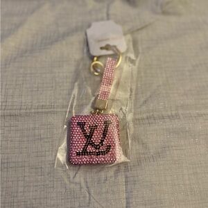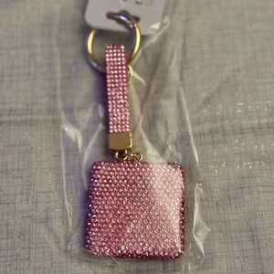 Sparkling pink rhinestone keychain with gold accents. Features a stylish design.