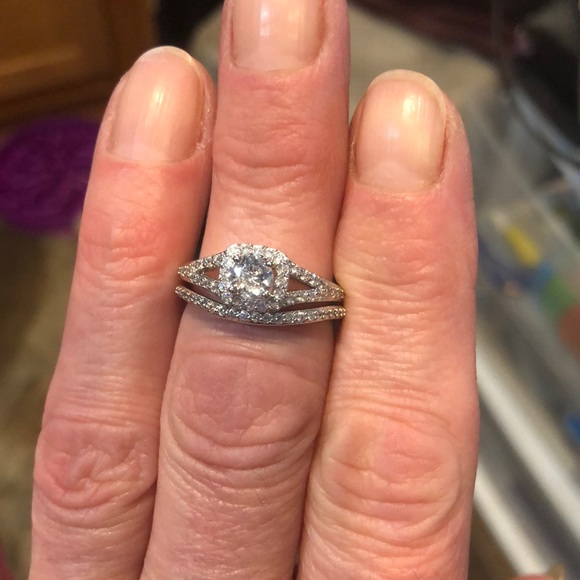 These are a size 8 sterling silver, cubic zirconia engagement and wedding ring set. They are very shiny stones.