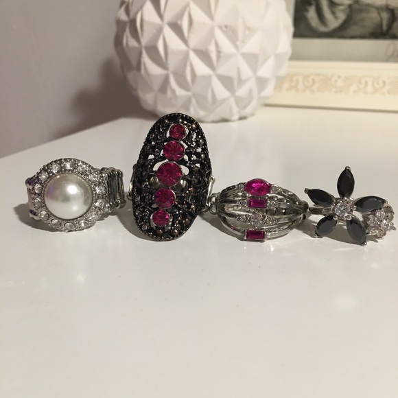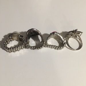 3 stretchy banded fashion rings, one size. 1 fashion ring, I’m not sure what size it is but I would say a 7 or 8. All in good condition, just consolidating my collection as I don’t ever wear them!