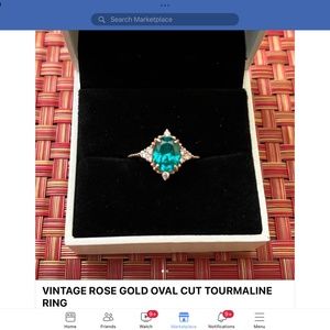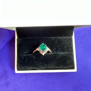 Rose gold plating over sterling silver. Center stone is Tourmaline Green and is a 2 carat stone. Ring is accented by 8 small cubic zirconias