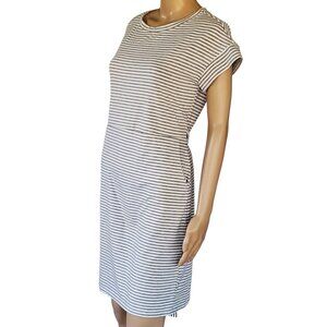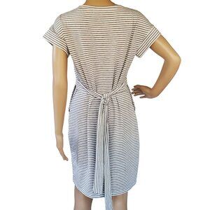 Fashion Sheath Dress Gray & White Striped Soft Casual T Shirt Tie Back Pockets
