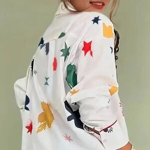 Fashion Oversized Textured Fabric Stand Collar Love Hearts Stars Birds Prints Red Trim Women's Shirt.