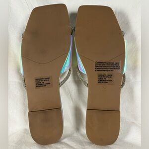 New Without Tags. Fashion To Figure Sylvie Silver Holographic Iridescent Rhinestone Sandals. Embellished crisscross straps set apart the Sylvie sandal. With a slide silhouette for ease of wear, its square-toe silhouette adds an on-trend finishing touch. Metallic Vinyl upper. Slip on for easy entry. Flat heel. Open square toe. Faux Leather lined footbed. Rubber outsole. Rhinestone embellished crisscross straps. Size 7 W (wide).