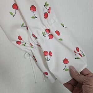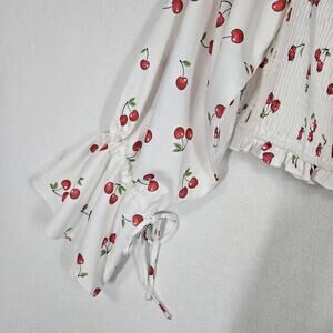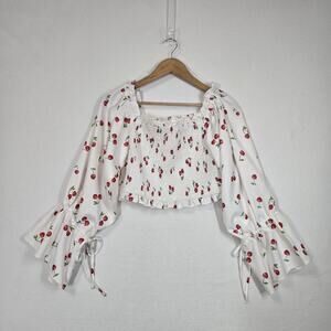 Fashion To Figure Tatiana Off Shoulder Cherry Print Crop Top Sz 1 White Red Green. Smocked. Cropped Length. Very Long Sleeves with ties.