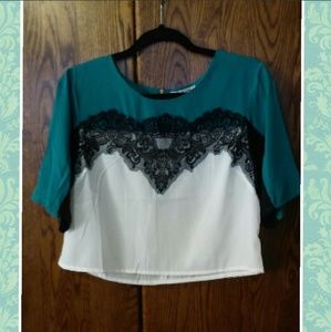 Teal and Awhite top with black lace detail on front. Gold zipper in back. New with tag.