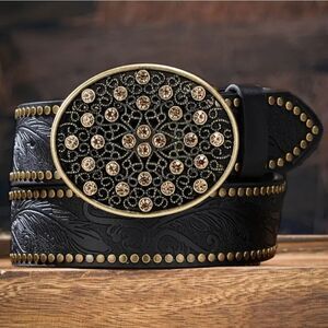 Women's Fashion Vegan Black Leather Belt, Boho Western Style, Embossed Pattern, Metal Buckle with Rhinestones, Casual Western Cowboy Look, Regular Fit. Black Vegan Leather.