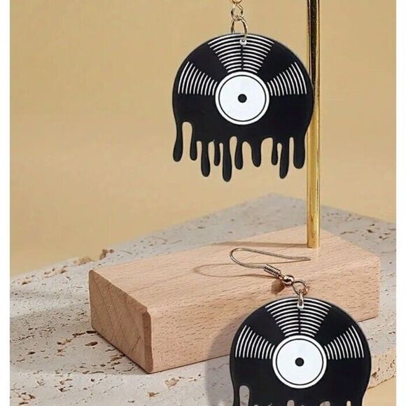Fashion Vinyl Record Drop Earrings Gold Tone Y2K