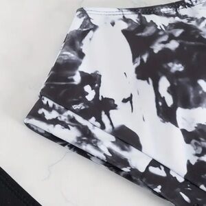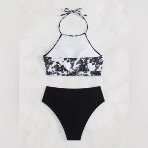 Elevate your beach or poolside look with this chic 2-piece black and white tie-dye bikini set. The bralette-style halter top features tie strap and removable pads for a comfortable fit, while the high-waisted bottoms provide coverage and a flattering silhouette. Made with a blend of polyester and elastane, this swimsuit is both stretchy and quick-drying for all-day comfort.