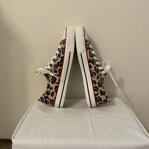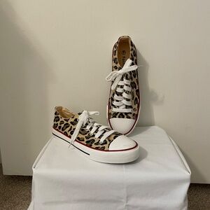 Women's US Size 7-Low top, lace up Leopard print sneakers. Upper & lining canvas, rubber sole. Red & black trim outside of shoes around rubber sole. Brand new without box. Shoes have never been worn. Please be sure to look at all of the photographs as those are part of the description. If you have any questions, please feel free to contact me.