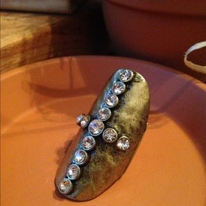 Hammered antiqued gold stretch ring with clear crystal cross.