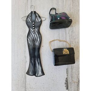 Product has mild scratches and glue residue on all black purse, not all same brand, but otherwise in good condition, set of 3
