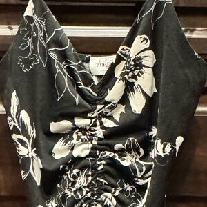 Elegant black and white floral ruched dress. Perfect for any occasion.