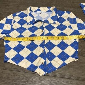 Fashion nova a day at the race | tan & blue checkered triangle crop button up| M