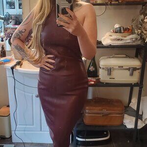 Lined faux leather, size 4-6us will comfortably fit, has good stretch If you're curvy. Hits just below knee on me and I'm 5'4, 36-26-38. Tags still on, simply tried on. Make an offer and get a new sexy date night dress. House of CB for exposure.. very classy modern look and faux leather is butter soft high quality. Fully lined.