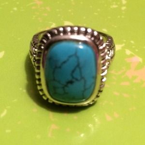 This silver tone ring features an oval simulated turquoise cabochon and Bali - inspired accents.
