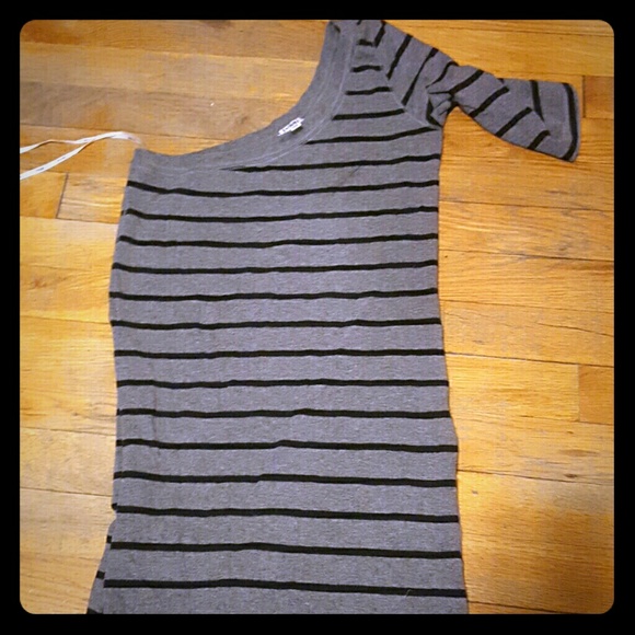 Grey and black shirt. One sleeve, long torso. Very easy to wash.