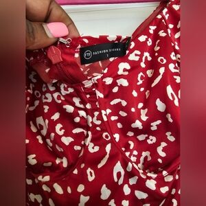 Chic mini dress with red and white animal print pattern. Features sweetheart neckline, with built-in bra, puff sleeves, a tie waist, flouncy/ruffled hem line at the bottom of the dress, and zips up in back, so cute (see photos)!!