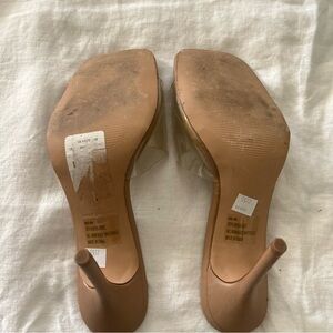 Step out in style with these elegant tan high heel sandals. Perfect for any occasion, these shoes offer a chic and modern look. The clear strap adds a unique touch, making them a versatile addition to your wardrobe.