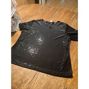 Fashion Bug top, women’s size 18 20, bold sequin blouse, black velour shirt, velvet look top, sparkly plus size top, glittery pullover, short sleeve party blouse, metallic sequin top, holiday outfit, cruise wear, evening wear, anniversary outfit, church top, stretchy blouse, polyester spandex blend, round neckline, side slits, good used condition, laid flat measurements