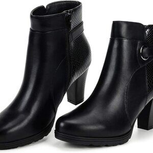Features: These stylish ankle boots feature a solid 3 inch chunky stacked heel that offers height with stability — perfect for adding a trendy edge to your outfits. The convenient side zipper makes slipping in and out effortless, while the buckle detail adds a sophisticated touch. Made with high-quality PU for a snug, comfortable fit, and the non-slip rubber sole keeps you steady on any surface.