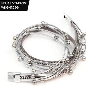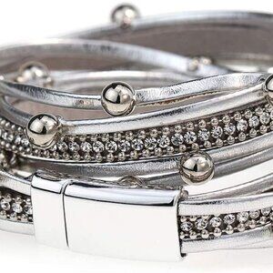 Features: Handmade multilayer braided leather bracelet accented with rhinestones and beads. Features a magnetic buckle for easy wear and a secure fit. The shiny artificial leather combined with elegant embellishments creates a versatile accessory that transitions effortlessly from day to night.