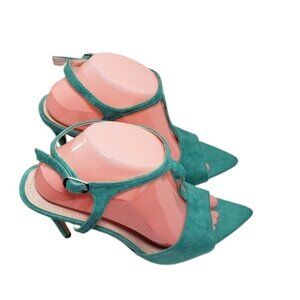 Condition: Pre-Owned - Good - Green Open Toe T-Strap Buckle Stiletto Slingback Suede Heels. Like New Condition.