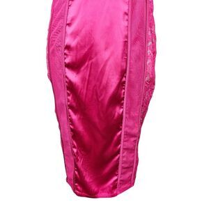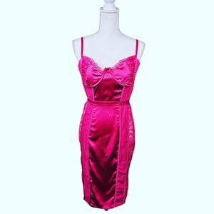 Glamorous and curve-hugging! This satin midi features a corset-style bodice, lace side details, and adjustable spaghetti straps. Stretchy bodycon fit for that perfect silhouette. Women's size Medium. Like new condition. No flaws. Measurements in photos.