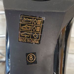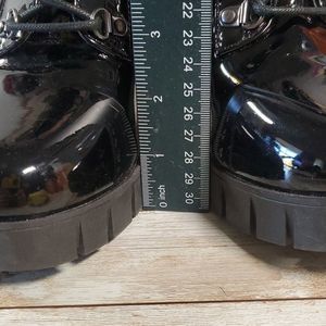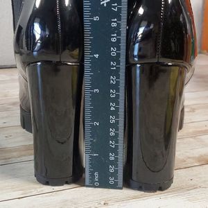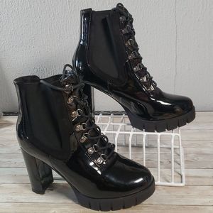 This black ankle boot by Fashion Nova features patent faux leather uppers, slip on opening with elasticated side gussets,, lace up front with metal grommets & d-rings & a 4" high chunky block heel & 1" high platform combination with a lug sole. Sweet 90's goth, Frankenstein or rocker boots.