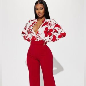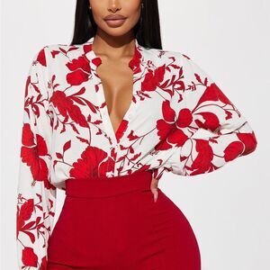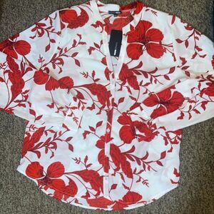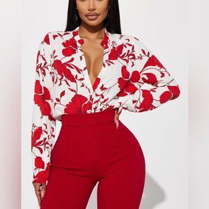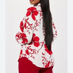 Fashion Nova New Floral Red and White Women's Top Black Logons Sleeve Size L