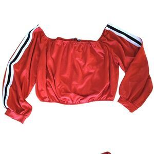 Retro. Red fleece, with racer side stripes in black & white. Long sleeve, cropped, off the shoulder top. Cinched, elastic hems. Pull on, ultra high waist, elastic band, shorts. Polyester, Raton, Spandex