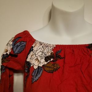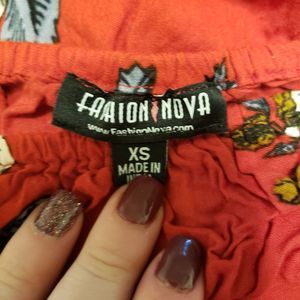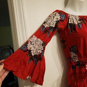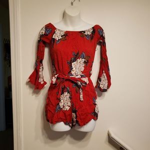 EUC size XS red floral long sleeve Fashion Nova shorts romper. Has of the shoulder sleeves with bell opening. Tie around waist.