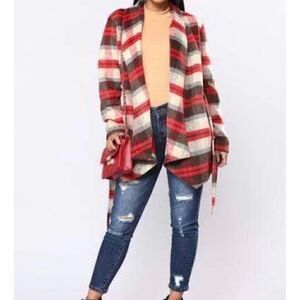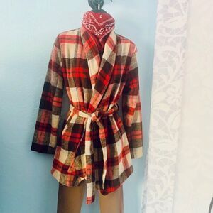 Cute plaid flannel belted coat. Red tan & brown. Drape lapel collar. Two front pockets. Belt loops with tie belt. Asymmetrical hemline. Warm wool/ polyester fabric. In great preowned condition. Fashion Nova Size Small