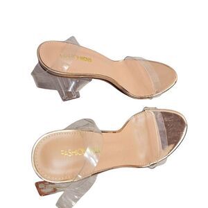 Fashion Nova's "The Glass Slipper" heels in the Rose Gold colorway, Maria-2F, size 8.5. New. Box has a little damage. Wraps around ankle. 1.5lbs with box. 4" heal