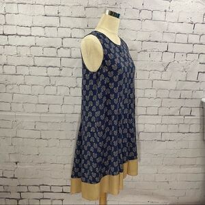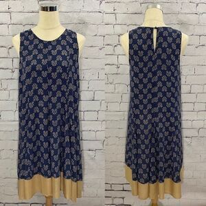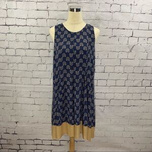 Navy blue with cream colored floral pattern. Tan layer at hemline.