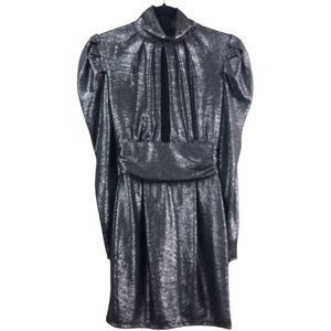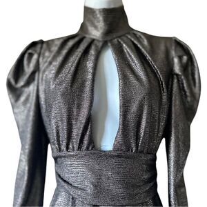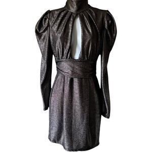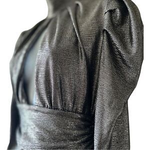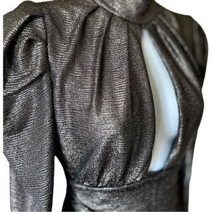 The dress has a metallic gunmetal sheen that catches the light just right