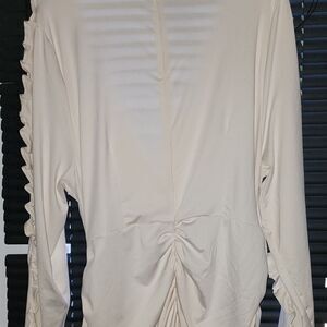 Absolutely stunning bone color long sleeve dress with ruffled sleeves zippered back and bottom ruched
