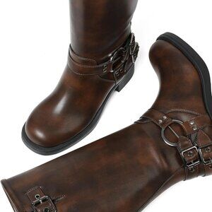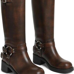 Ships quick from smoke-free, pet-free home. Happy to bundle & save — feel free to ask!"}#endregion}}</json-helper>12412]}]}### Assistant:)}### Fashionable Brown Knee High Riding Boots for Women with Chunky Heel — A chic, versatile staple. Size: 8.5 Color: F-brown Condition: Brand new, no flaws. Features: These stylish riding boots feature a sleek lace-up design with zipper accents and chic buckles. The rubber sole offers durability, and the chunky 2-inch heel adds a touch of lift. Pull-on style makes them easy to wear all day. Material: Synthetic outer material, rubber sole Measurements: Heel height: 2 in Great for: Perfect for country music festivals, parties, rodeos, shopping trips, or dressing up for weddings. Stylish with jeans, skirts, or dresses for fall or spring wear. Ships quick from smoke-free, pet-free home. Happy to bundle & save