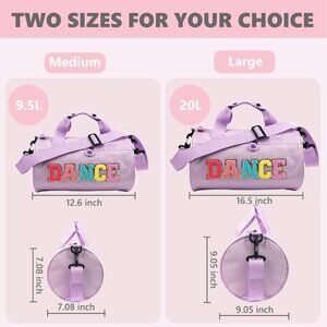 Features: Adorable and stylish medium-sized kids dance duffle bag with a cheerful embroidered 'DANCE' in colorful chenille. Features multiple compartments, including a main space, front pocket, and adjustable, removable shoulder strap for versatile carrying options. Crafted from durable, water-resistant nylon that's easy to clean and built to last. Lightweight and roomy enough for shoes, clothes, snacks, and accessories, making it perfect for dance class, gym, sleepovers, or trips.