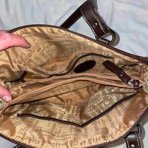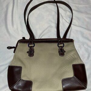 This stylish purse is has leather accents and features two larger compartments and one smaller, zippered compartment in the middle. There is a zippered pocket on one side and several open organizational compartments. The bag measures 11" long and 9" tall. The leather shoulder straps are approximately 11" long.