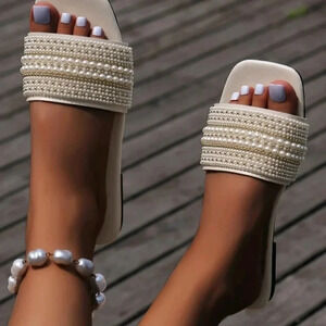 Fashionable Faux Pearl Decorated Square Toe Flat Sandals For Summer