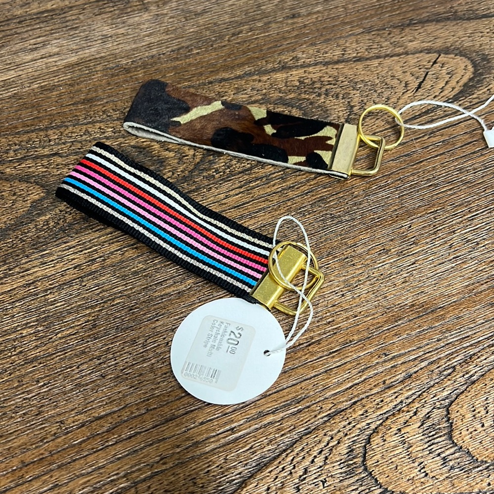 One multi colored striped and the other a textured camp patterned keychain for either your keys or wallet!