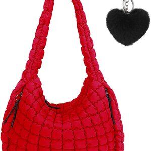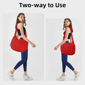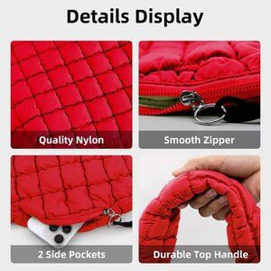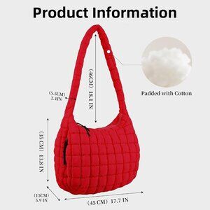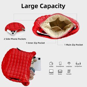 Features: Stylish quilted puffer tote bag with a soft, lightweight nylon feel. Generous size (17.7 x 13.8 x 5.9 inches) that comfortably fits your laptop, books, cosmetics, water bottle, and more — all without feeling bulky. Comes with a main zip pocket, two side zip pockets, and an interior zip pocket to keep everything organized and secure. The wide, padded nylon shoulder strap (18.1 inches long) makes it super comfy for long wear, and the durable zipper keeps your essentials safe.