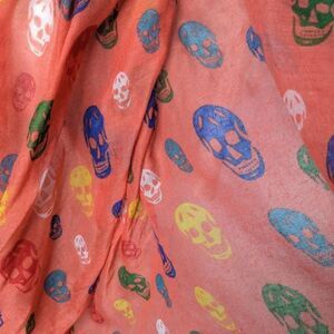 Unique, fashionable, and eye-catching - this extraordinary Skull Pattern Design Inspired Multi-colored Skulls Scarf Orange Large scarf is a must-have! Lightweight and easy to wear, it offers a comfortable fit so you can rock it in any season. Made of 100% polyester. Approximate measurement in inches, length is 70, and width is 20.5