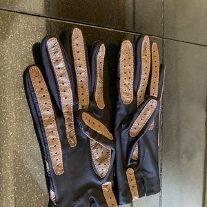 This is a beautiful pair of vintage Isotoner driving gloves. They are in gently used condition. They are black with brown leather trim. They are unlined. They measure 8". They
