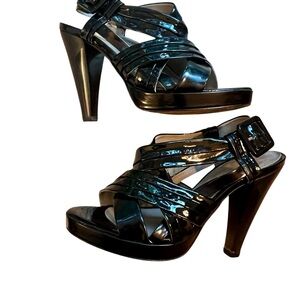 Turn heads in these striking Fashionista heels, designed with glossy black patent leather crisscross straps and a bold, sculptural silhouette. The standout feature? A chunky heel with a clear lucite cutout that adds modern edge and elegance. Finished with a platform base and adjustable buckle strap for added comfort and style — perfect for nights out or special occasions.