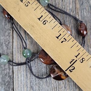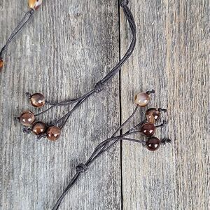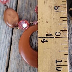 A lovely carnelian colored statement piece by Charles Klein, a long beaded necklace on leather and a multicolored wooden elastic bracelet plus 2 pairs of earrings. All in great pre-owned condition.