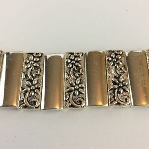 Fashion jewelry silvertone bracelet with Floral Accent and magnetic fold over closure. Bracelet has barely noticeable scratch marks, that are magnified by the lighting and Camera in pictures.